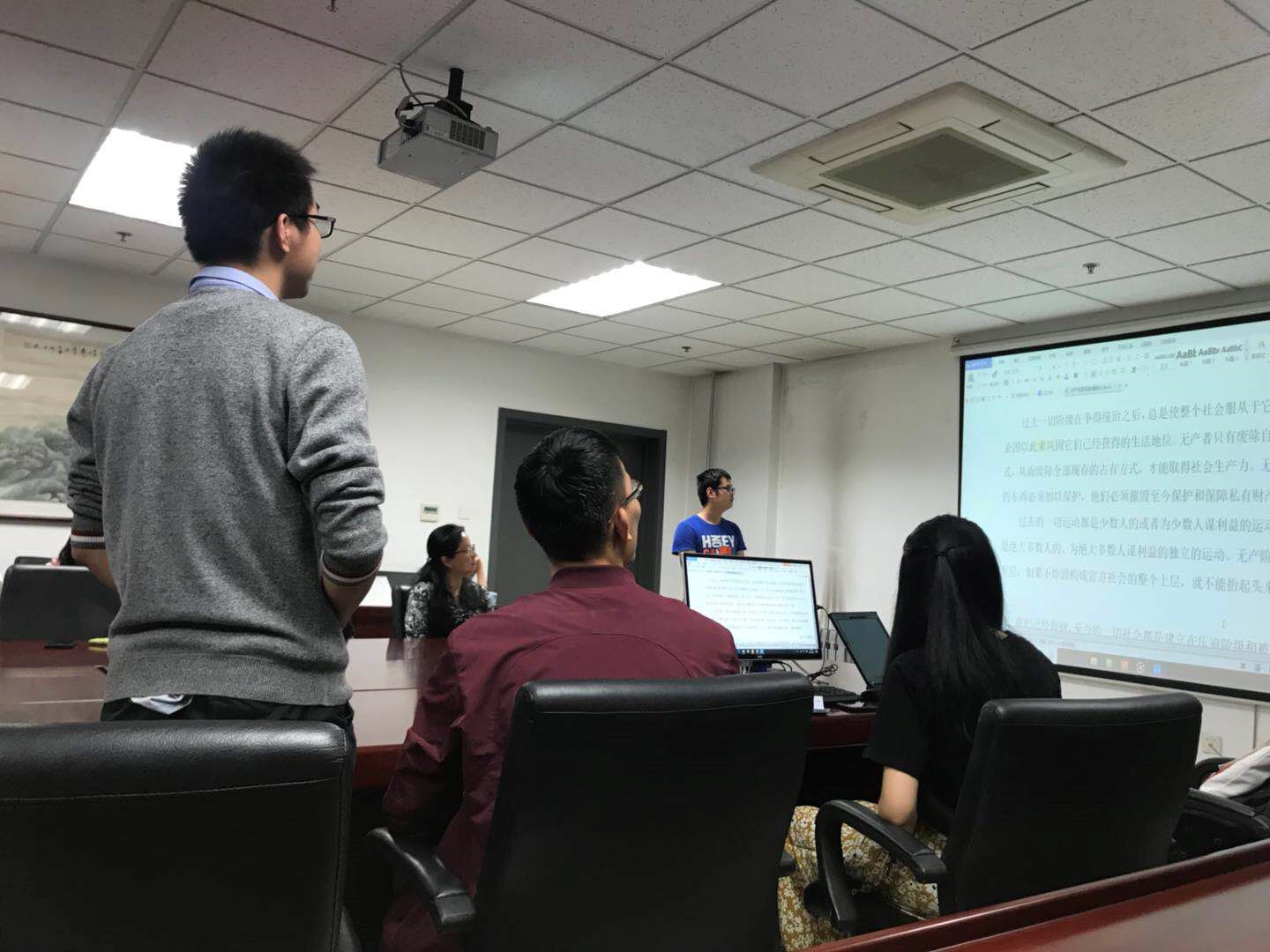 品经典诗歌,赏文化精髓。523日晚,材料学院硕7016党支部联合外语院党支部在外语楼912室组织了一场“中外思想荟 语贯中西 经典诵读”活动。为了丰富校园文化生活,陶冶工科学院的学生情操,感受中华五千年经典文化的魅力,开展毛泽东经典诗集的中英法三种语言朗诵活动,共同学习共产党宣言,提升大家党性觉悟。