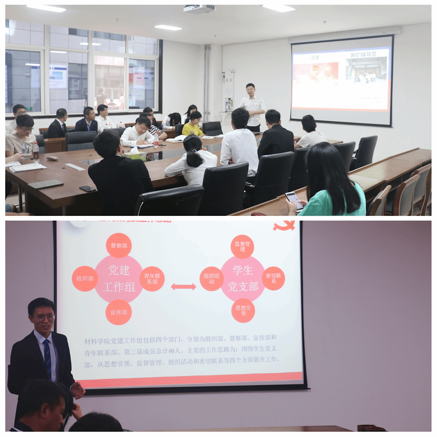会议在激昂的国歌中拉开了序幕,学院团工委副书记葛益和党建工作组组长张建飞分别做了年度工作总结汇报。葛益分享了自己一年在团工委副书记这个工作岗位上的收获和体会,并强调了这个职位的重要性和关键性。他指出,“学生组织是学院工作的中坚力量和强大帮手,希望大家共同努力,创造材料学院更加辉煌的明天。”张建飞主要介绍了党建工作组一年以来的工作完成情况以及举办的一些特色活动,“西迁”精神学习系列活动;支部标准化建设;构建活力党建活动,党建学习参观系列活动、宣传技能培训系列活动、专题辩论赛等等。对于新一届的党建工作组,张建飞表示,“团结一致,共同奋进,形成一个极具凝聚力的团体,发挥组员引领、示范作用,传播正能量。”