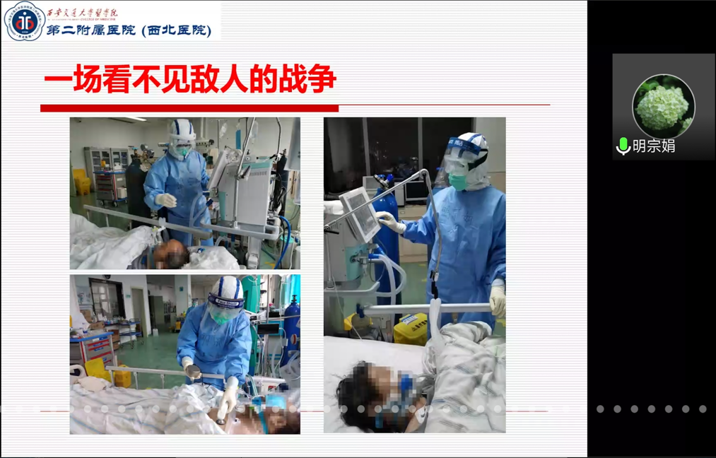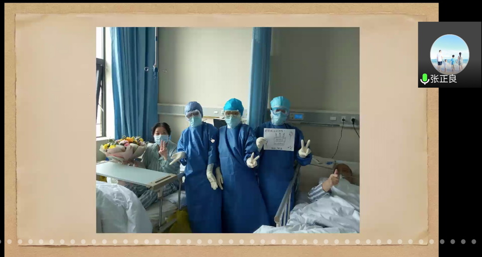 接下来,明宗娟医生分享自己的抗疫经历:逆行抗疫中的成长。明宗娟医生从“非典”开始介绍自己的成长历程,明医生身为一个湖北人,在抗非英雄的激励下,在前辈的带领下,从一个交大的医学生到现在的逆行者。明医生和同事们每天基本连续工作十几个小时,共同从死神面前解救一个又一个的患者。最后,明医生勉励同学们不忘初心,勇于奋斗。