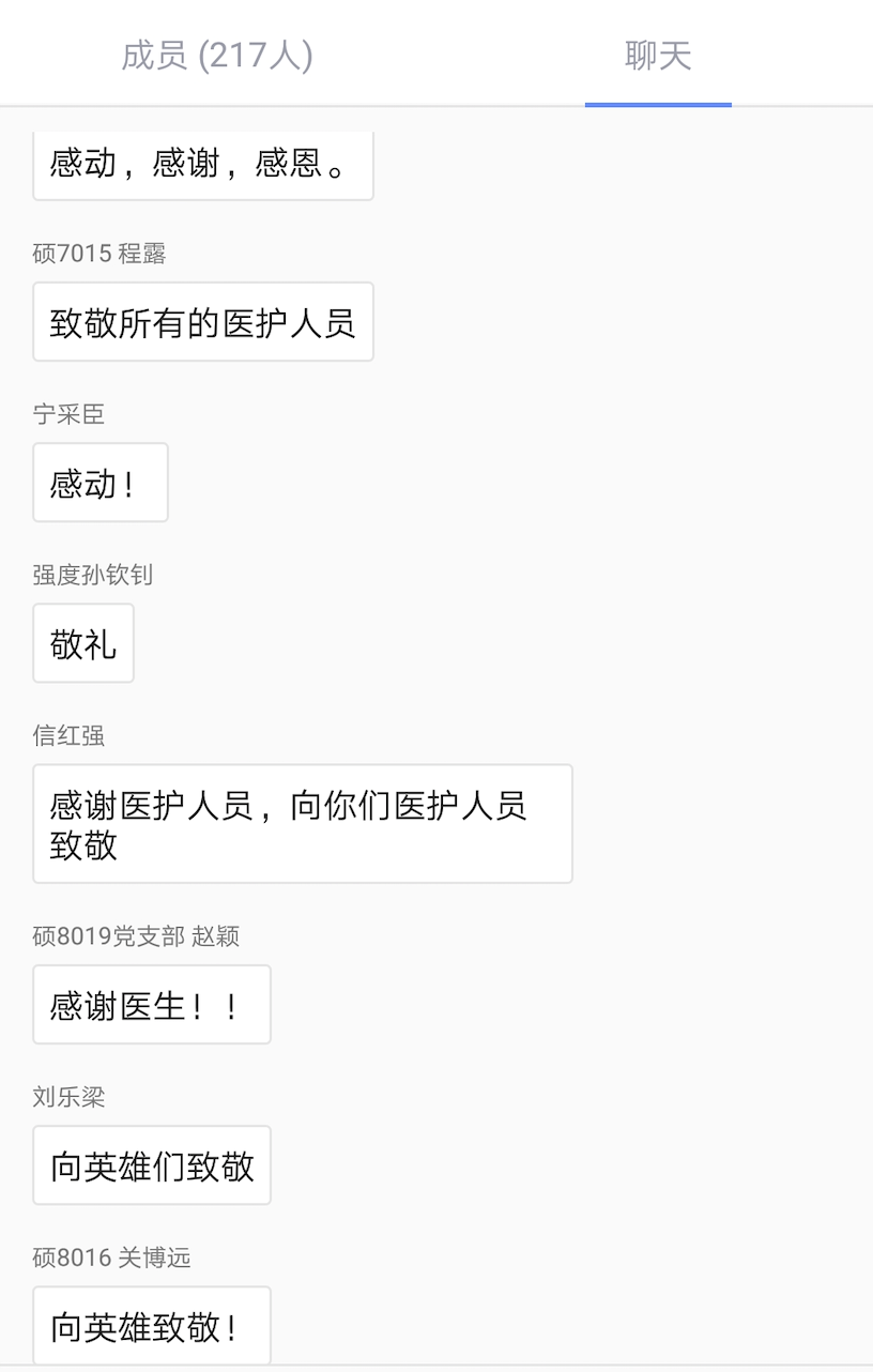 在会议即将结束之际,支部许多同学都在留言区表达了对两位抗疫英雄的感激与赞扬,同时也表达了对所有在疫情期间抗击在一线的英雄们的致敬。这是一次独特的生活会,直接听亲历抗疫的英雄们讲述抗疫的故事令支部所有同学都感触颇深,也让支部各位同学在未来的工作生活中时刻铭记这些抗疫的精神以砥砺前行。