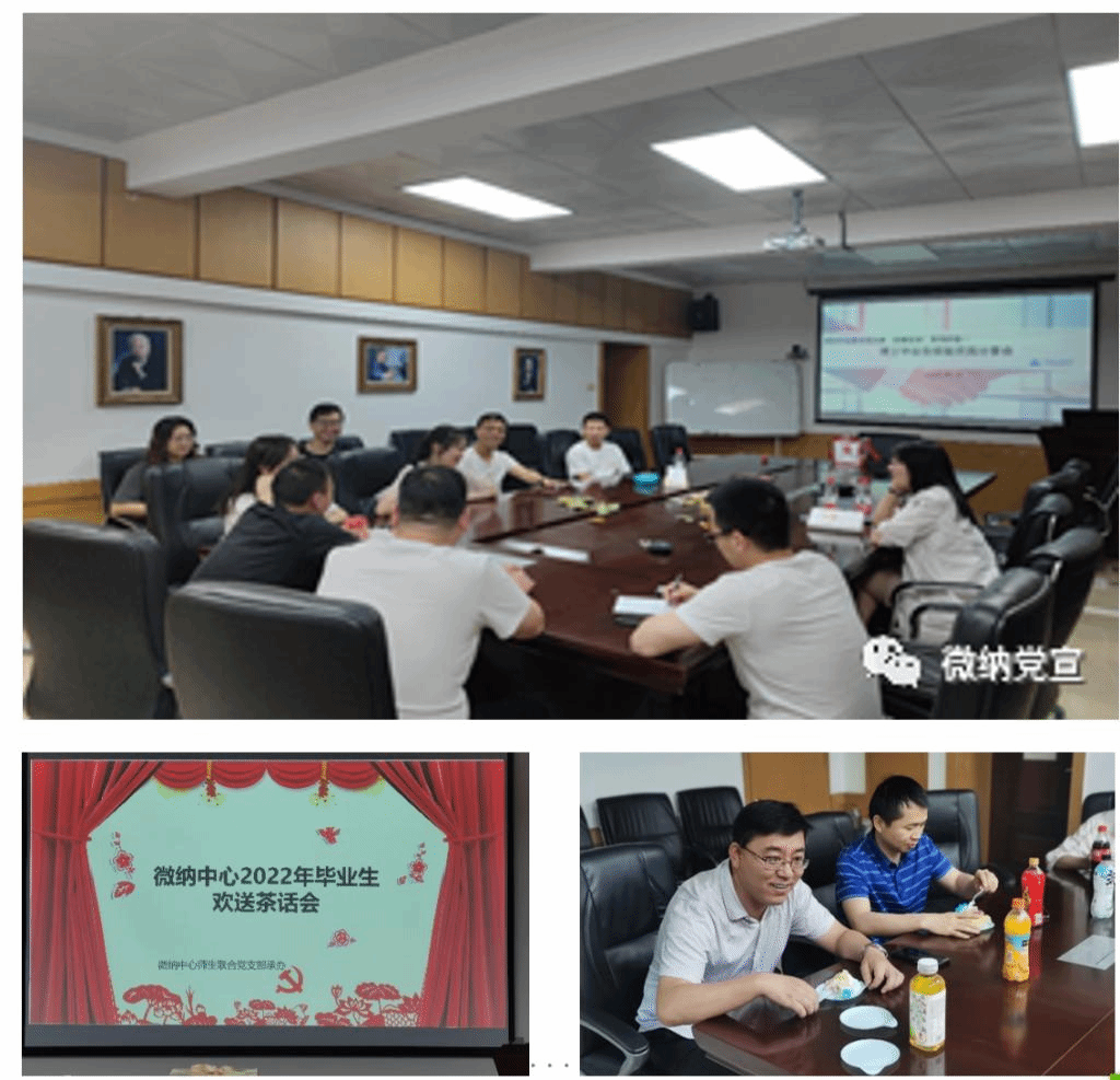 在毕业之际,支部还开展了毕业生经验分享与毕业生欢动活动,包括于6月16日举办的毕业生欢送茶话会和6月17日举办的毕业生交流分享会。材料学院院长单智伟同志、微纳师生联合党支部书记韩卫忠同志、微纳中心主任匡文军同志、实验技术组郭朝维老师、中心青年教师、2022届中心全体毕业研究生参加了茶话会,在会上毕业生们敞开心扉,回顾了科研生活中的趣事,送上了对老师与中心的感谢,表达了对师弟师妹们的美好祝福,各位老师也欢迎大家常回来看看。本次活动加强了毕业生与微纳中心的情感纽带。