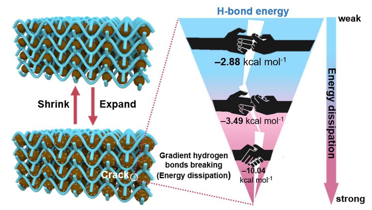 图1. 梯度氢键粘合剂的能量耗散次序示意图。