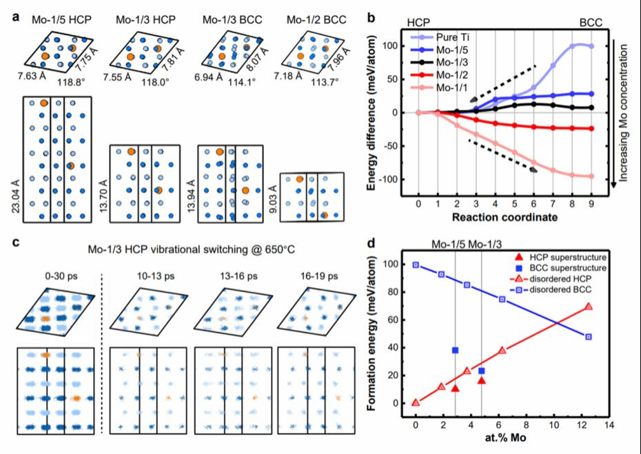 近日,利用先进的原位、多尺度电子显微镜技术,结合同步辐射和计算机模拟,浙江大学、西安交通大学和美国宾州州立大学研究人员对钛钼二元合金中的alpha-beta相变初始阶段进行了系统深入的研究,发现其原子尺度的过程与经典形核理论的机制具有显著差异。具体来说,研究人员在电子显微镜下的直接观察表明,当温度升高至相变点以下100℃左右时,beta相中过余的钼原子开始显著扩散到alpha相中,且随其浓度不断升高,钼原子开始呈化学有序排列,在alpha相中形成纳米尺度大小的亚稳态超晶格结构团簇,其成分和结构既不同于母相alpha,又不同于终相beta。超晶格亚稳结构中钼浓度的进一步升高促使原本的密排六方结构失稳,瞬间转变为体心立方结构,实现从alpha到beta的相变。第一性原理计算与模拟定量地揭示了上述过程中的能量变化(热力学驱动力)和需要克服的能垒与原子位移(动力学过程)。这一发现是原位、原子尺度实验与计算模拟紧密结合的成功案例,是非经典形核固态相变在钛合金中的首次报道,也为理解其它合金中固态相变初始过程的原子机制带来了新的启示。