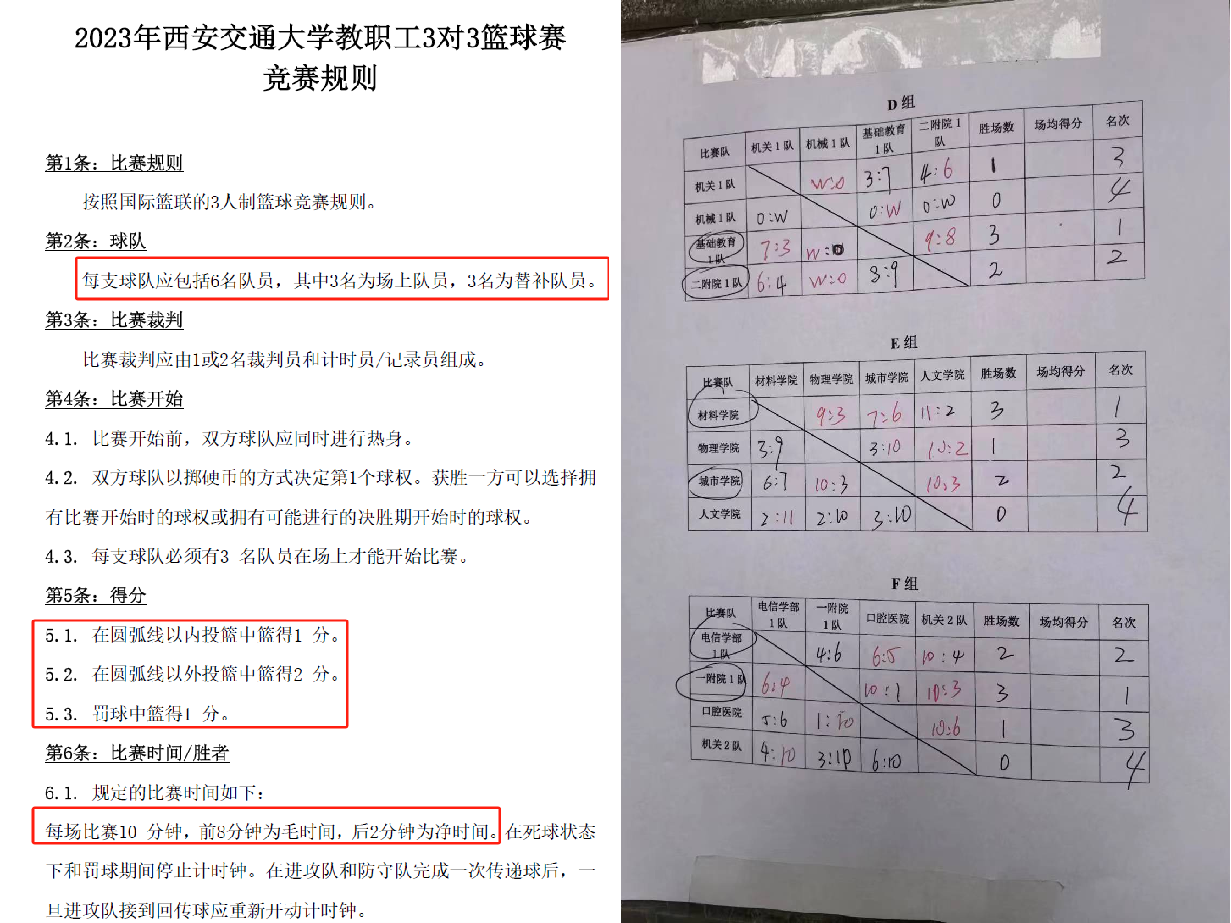 11月4-5日,由校工会和体育中心主办,教职工篮球协会承办的2023年西安交通大学教职工3对3篮球赛在兴庆校区西南篮球场举行。本次赛事共有33支男队和8支女队参加,材料学院教职工男子篮球队以勇往直前、永不言弃的决心,获得了第三名的优异成绩。