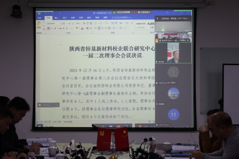 2023年12月16日上午,陕西省“四主体一联合”锌基新材料校企联合研究中心(以下简称:研究中心)一届二次理事会暨技术委员会在西安交通大学材料学院仲英楼第三会议室召开。本次会议有来自于中南大学、北京工业大学、西安建筑科技大学、西安理工大学、陕西科技大学、商洛学院、西北有色金属研究院、西安勘察设计院和西安交通大学等单位的二十余名专家学者参加会议,陕西省省级相关部门、商洛市科技局等领导受邀参加会议。会议采取线上线下相结合的方式进行。