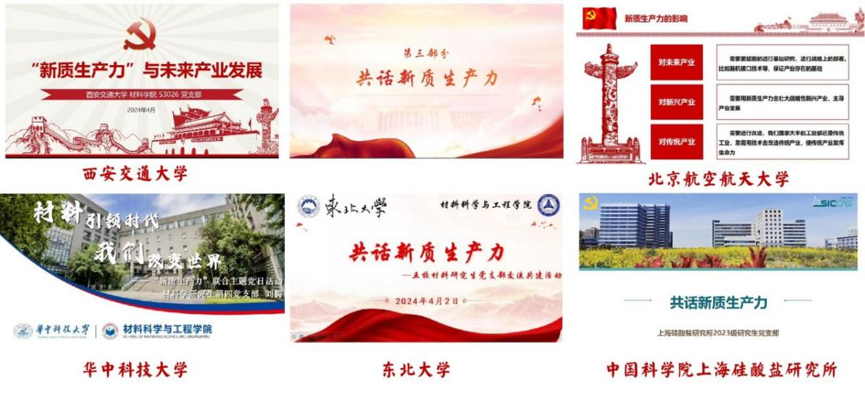 为加强研究生对两会精神的学习,深入了解“新质生产力”,增进不同学校研究生之间的学习与交流,4月2日,西安交通大学材料研究院硕3023、3026党支部联合华中科技大学材料学院材料学研究生第四党支部联合、北京航空航天大学前沿科学技术创新研究院增材制造学生党支部、中国科学院上海硅酸盐研究所2023级研究生党支部、东北大学材料科学与工程学院2023级各硕士党支部开展了“解读新质生产力 共话国家新征程”五校材料研究生党支部联合主题党日活动。活动特别邀请到中共宁夏回族自治区委党校刘彩霞教授为大家作“解读新质生产力”报告。东北大学材料科学与工程学院党委副书记兼副院长黄晓颖老师、北京航空航天大学前沿院院长助理李卓老师、西安交通大学材料科学与工程学院党委副书记魏炜老师出席活动并致辞。五校的党支部研究生党员200余人以线上线下相结合的方式参加此次活动。活动由西安交通大学材料研究院硕3023党支部杨旭东主持。