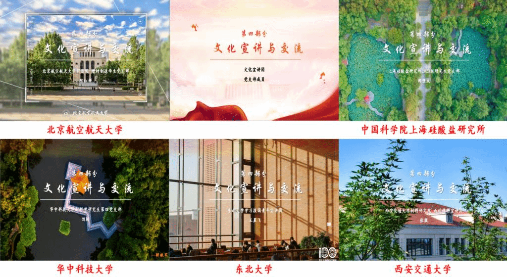 活动最后一项,文化宣讲与交流。各支部以新质生产力为主题,从支部建设、学院风采、学校文化等方面开展了深入交流。北京航天航空大学陈红研同志从支部建设出发,分享了“为同志服务”的支部文化。中国科学院上海硅酸盐研究所韩壁成同志分享了上硅所的建所史和现有研究方向。西安交通大学张微同志宣讲了西安交通大学的“西迁精神”。东北大学王晨飞同志带领大家学习了“学习贯彻习近平总书记给东北大学全体师生的重要回信精神”。华中科技大学材料学研究生第四党支部刘腾同志分享了身为材料学子投身于国家建设的重要性。
