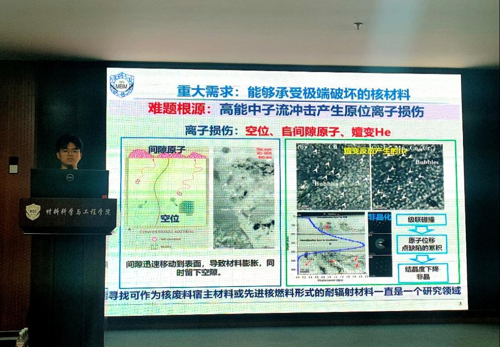 西安交通大学的范晓轩博士进行了“纳米结构多层膜的界面控制力学性能和辐照硬化”的报告。报告针对高能中子流冲击容易造成核材料产生原位离子损伤的问题,基于界面工程引入高密度的界面作为辐照缺陷的陷阱。采用沉积态层状结构Cr/Zr涂层,研究了多层膜涂层辐照前后的组织稳定性与力学性能。