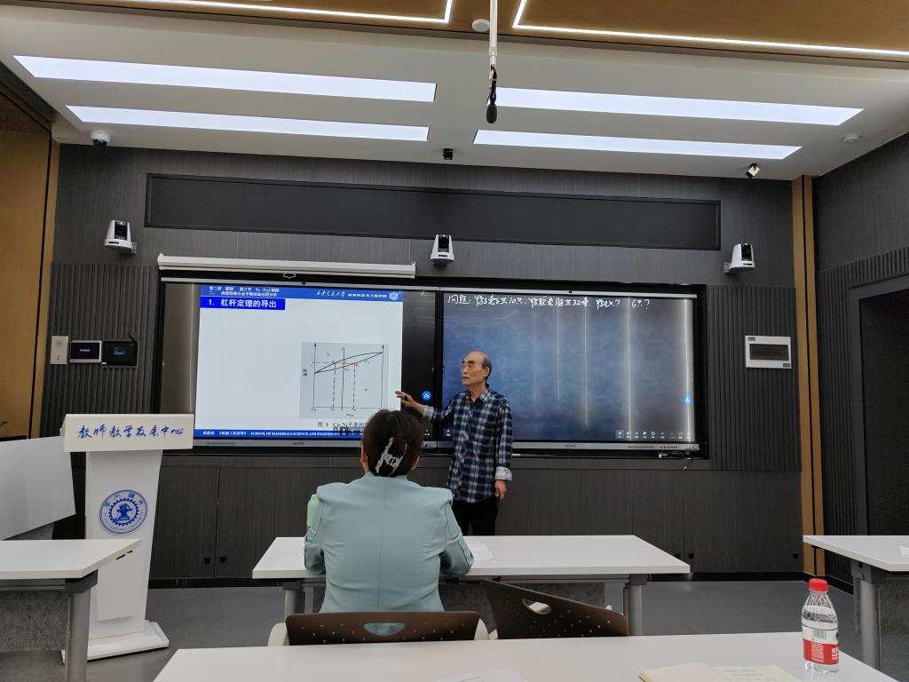 第三位是原课程负责人范群成教授讲授知识点“杠杆定律”。范群成教授是国家级精品课程工程材料基础的课程负责人,退休后是学校本科教学督导专家。范教授通过精心教学设计,为大家带来了一场别开生面的杠杆定律示范授课,讲授中他注重全程互动,问题层次递进,抽丝剥茧,讲出了杠杆定律的本质和内涵,最后还非常巧妙地设计了课程思政环节,完全实现了沉浸式教学,获得了听课教师的一致好评。