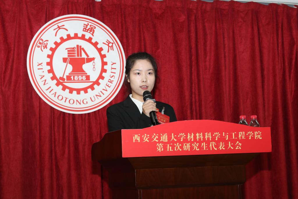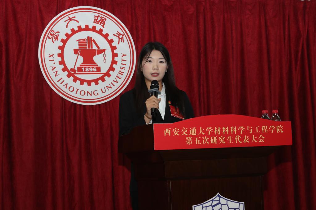 西北工业大学材料学院研究生会主席团成员魏永腾代表兄弟院校向材料学院第五次研究生代表大会的召开表示祝贺。她表示,西安交通大学与西北工业大学共同扎根西部,始终并肩担当国家重任,愿两院在未来工作里继续发扬优良传统,不断开拓创新,共同为全体研究生创造更加美好的学习和生活环境,推动两院发展迈上新的台阶;同时,两院研究生应牢记党的教诲,立志民族复兴,这是每一位新时代青年成长成人成才的必由之路,也是解答第二个“百年奋斗目标”时代考卷的题中之意。