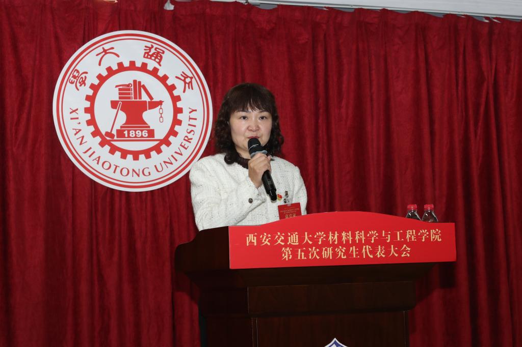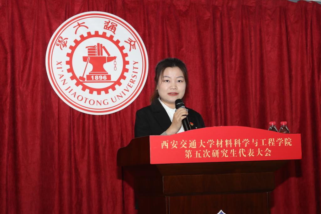 材料学院党委书记高宏在致辞中表示,本次研究生代表大会是学院凝心聚力开创研究生工作新局面的一次青年盛会,对学院进入高质量特色发展的新征程具有重要意义。过去的一年,学院在人才培养、学术科研、平台建设和文化建设等方面取得了可喜的成绩,每一项成果的背后离不开全院研究生的默默付出。同时她对同学们提出了三点希望:一是希望同学们争做西迁精神的新传人,抓住新时代新机遇,到祖国最需要的地方建功立业,在新征程上创造属于我们这代人的历史功绩;二是希望同学们胸怀国之大者,勇担历史使命,将坚持科技自立自强、实现中华民族伟大复兴作为自己的历史责任;三是希望各位研究生代表及研究生会成员发挥桥梁纽带作用,谨记自己作为一名“服务者”的身份,使研究生会等学生工作体现材料学院的专业与专长,展现材料学院的特点与风采。