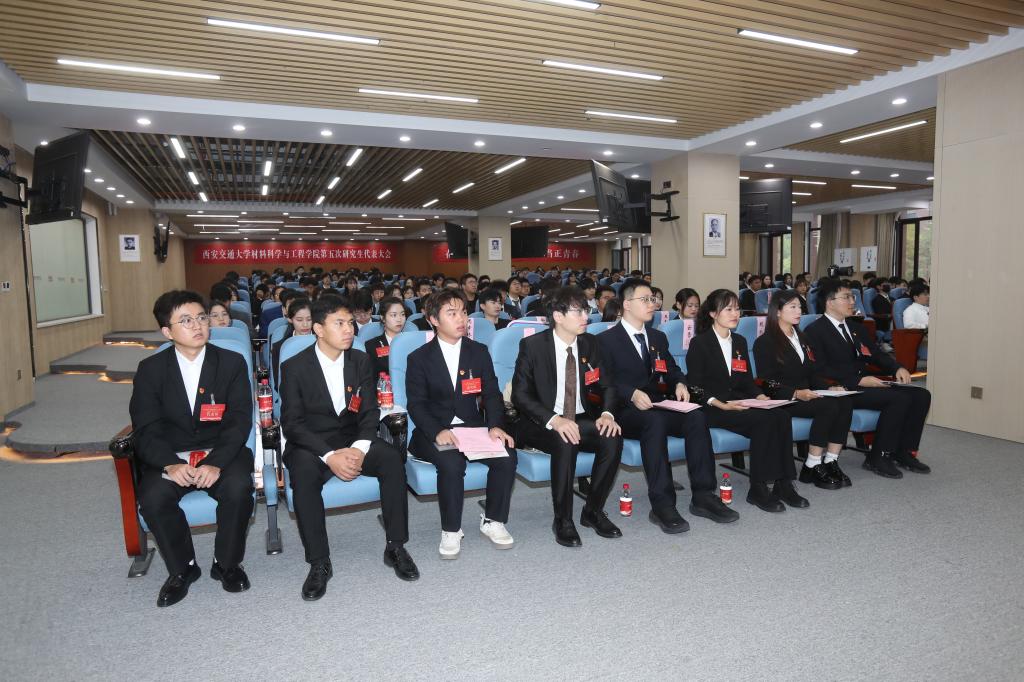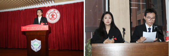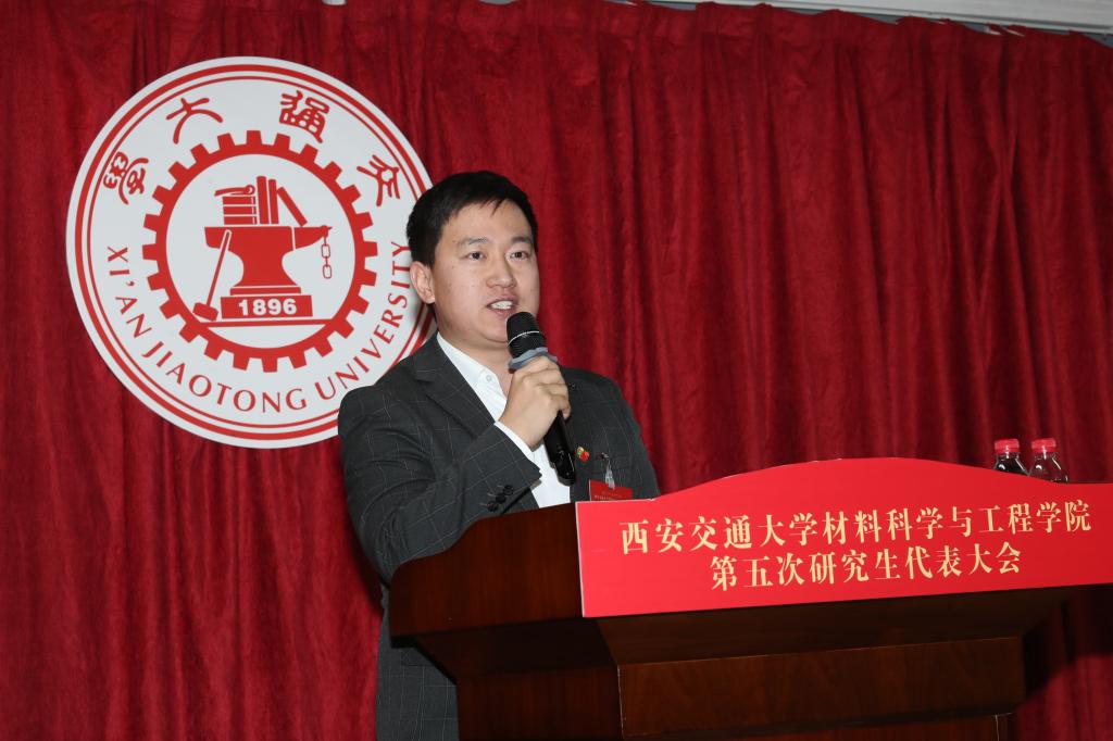 西安交通大学材料学院院长丁向东、党委书记高宏、副书记魏炜、校研究生会主席团候选人宋宇飞、西北工业大学材料学院研究生会主席团成员魏永腾,以及材料学院学工系统全体老师出席大会。材料学院110名正式代表参加大会,机械学院、电气学院、能动学院、航天学院等兄弟学院的研究生会主席团成员代表参会,同时还收到清华大学、哈尔滨工业大学、上海交通大学、浙江大学等17所高校的贺信。本次大会由材料学院团委书记李博副教授和研究生会主席团候选人杨旭东同学共同主持。