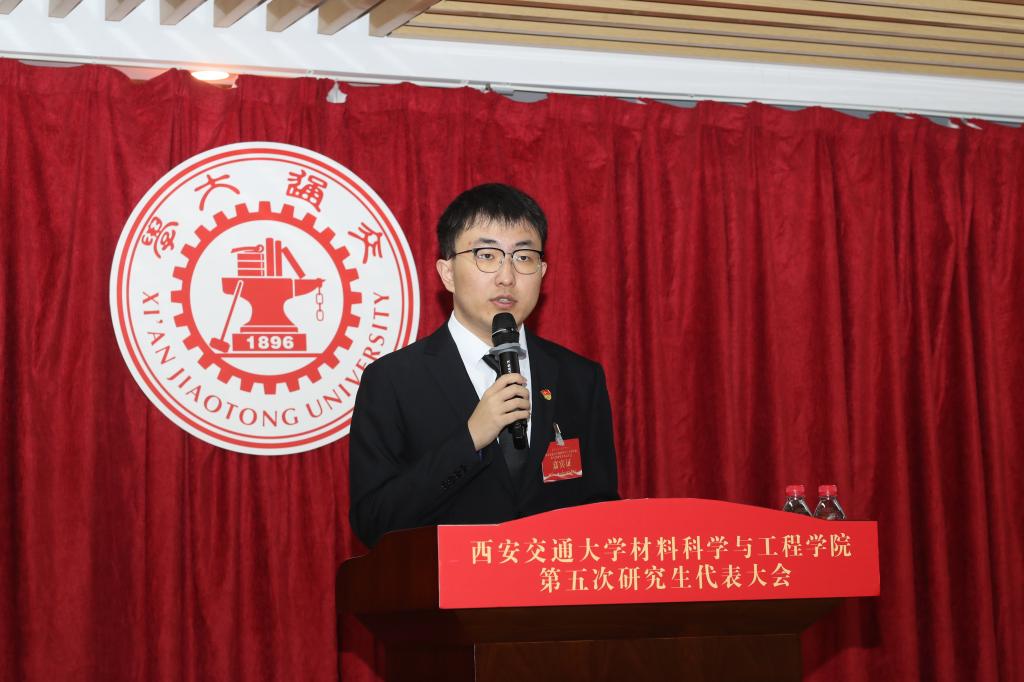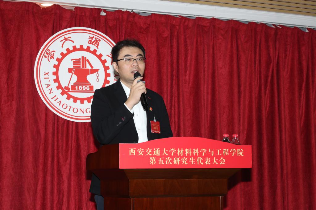 宋宇飞代表西安交通大学研究生会主席团对材料学院第五次研代会的召开表示祝贺,充分肯定了材料学院研究生分会过去一年取得的工作成果,并提出三点期待:一是要以习近平新时代中国特色社会主义思想为指导,以加强对同学的政治引领为根本,引领广大研究生同学深刻理解理论背后的价值温度;二是坚持从严治会,在改革创新中强化自身建设,确保研究生会的工作始终沿着正确的政治方向前进;三要践行服务宗旨,以增强广大同学的社会化能力为主要目标,以服务好、维护好、发展好广大同学的根本利益为出发点和落脚点,切实服务青年学子成长成才全面发展。