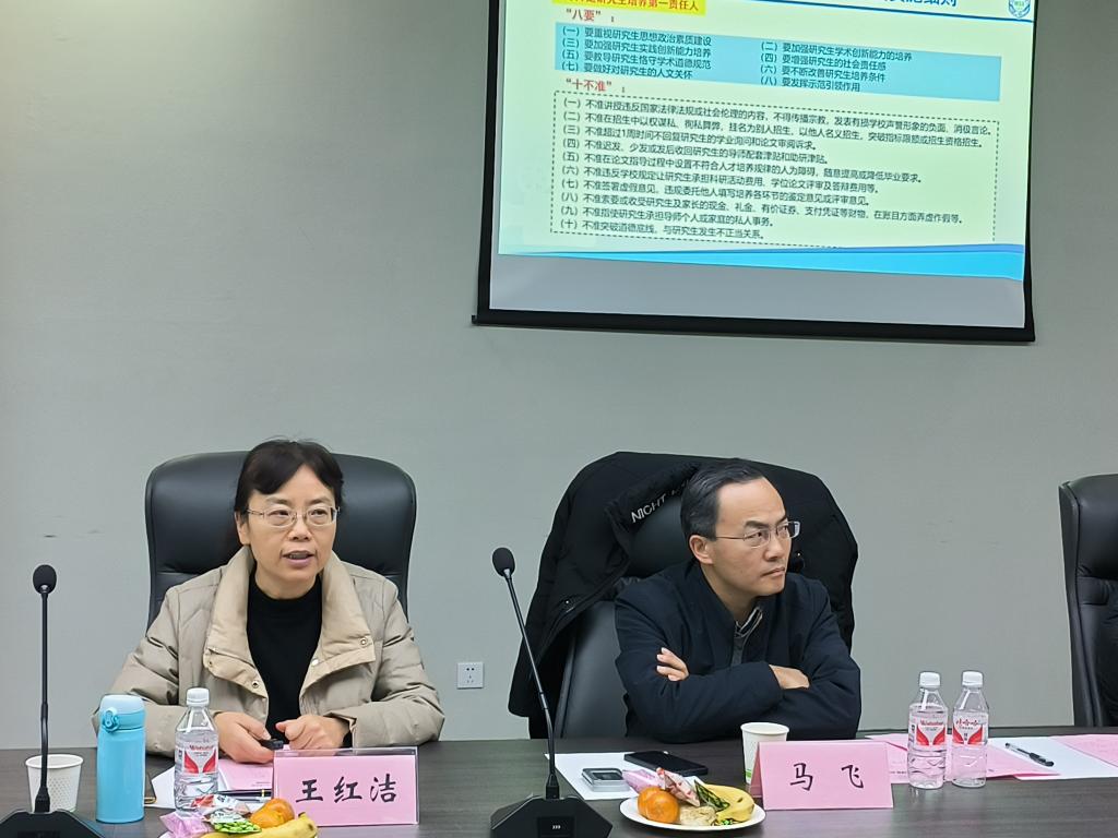 王红洁详细介绍了学院人才培养与教学管理相关政策,强调导师应具备思想引领和学术创新能力,同时以人文关怀呵护学生成长。她重申学位论文质量管理的重要性,要求导师将把关工作做在平时。同时,不仅注重学术成果,更要注重对学生人格的塑造与价值引导。