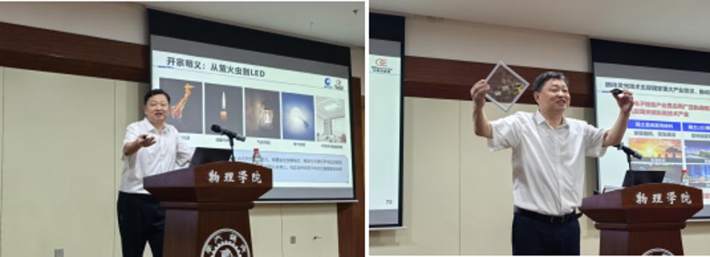 肖志国教授以自身四十年“追光”历程为脉络,系统介绍了稀土发光材料与半导体发光芯片的科学原理、关键技术突破与产业发展前景。他通过现场新蓄光发光材料演示和“9·11事件”中发光材料指引万人逃生的实例,生动阐释了新材料在应急安全与国防领域的重要价值。他从光致发光、电致发光等基础物理机制出发,讲解了电子跃迁和发光过程,介绍了发光分类与关键衡量指标,帮助同学们搭建起光电子领域的基础认知框架。