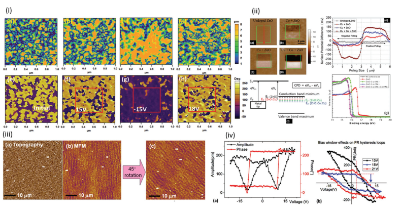 图三则包括了(i)压电力显微镜在ZnO 薄膜上的成像;(ii)开尔文扫描探针在ZnO 薄膜上的表面电势成像;(iii)磁力显微镜在ZnO 薄膜上的磁畴成像;(iv)在ZnO:Cu薄膜上获得的类似于铁电材料的回滞曲线。