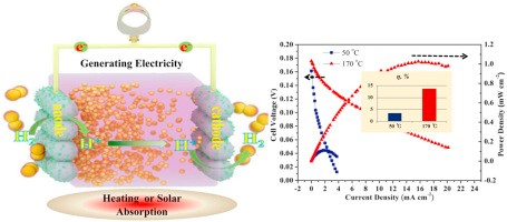 近日,西安交通大学材料科学与工程学院柳永宁教授课题组发明了一种热电转换氢离子浓差热电池,并与西安交通大学热流科学与工程教育部重点实验室陈黎教授合作进行了该电池的热电转化效率计算。该氢离子浓差热电池采用了燃料电池结构,利用离子浓差电池原理,实现了热-电转换。该电池的工作原理如下:氢气从阳极进入电池被氧化成氢离子,在阳极和阴极两侧形成离子浓度差,离子由阳极扩散通过质子交换膜后到达阴极又被还原成了氢气,在这个过程中氢气没有消耗,但贡献了电子,产生了电流,整个过程实现了热-电能转化。在170 oC工作时,该体系的电流密度最高可达21 mA cm-2,功率密度最高可达10.3 Wm-2,热-电转换效率达到了13.72%,该效率高于目前报道的热电材料的转换效率。基于燃料电池的结构特征,该电池也可以通过串联形成电池堆,提高电池的输出电压和功率。该项研究成果为热能利用提供了新途径。