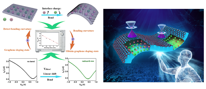 针对上述问题,西安交通大学材料学院功材中心设计出一种新型全无机柔性石墨烯场效应晶体管(GFET),利用纯机械应变和铁电薄膜Pb0.92La0.08Zr0.52Ti0.48O3的挠曲电效应成功地实现了石墨烯掺杂浓度的可控,发现石墨烯的狄拉克点(VDirac)随着GFET弯曲半径(正向弯曲或反向弯曲)呈线性变化。相比于其他调控石墨烯掺杂的方法,本工作具有以下优点:1)避免了杂化掺杂对石墨烯造成的破坏以及化学修饰掺杂带来的其他物质吸附;2)可逆、可控的;3)柔性的。基于以上的优点,我们所设计的全无机柔性石墨烯场效应晶体管不仅可以通过弯曲机械应力调控石墨烯掺杂,而且还可以根据柔性铁电栅GFET的VDirac变化来检测样品的弯曲状态。