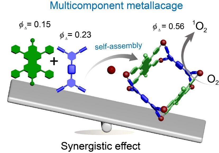 针对这一问题,西安交通大学材料学院的张明明教授课题组通过配位自组装将两种常见的光敏剂(苝酰亚胺和苯并噻唑)结合在一起,制备了一类桶状多组分金属笼。这种策略不仅通过带电荷的笼状结构之间排斥作用避免了其自聚集,而且还利用铂基配位键促进了系间窜越,提高了其单线态氧产生能力(单线态氧量子产率高达56%)。这些笼状化合物可以将一些烯类衍生物包裹进空腔内,通过可见光照产生的单线态氧将其氧化,表现出了优异的催化效率(产率>90%)、良好的光稳定性和可重复使用性。该项研究不仅提供了一种通过配位自组装构筑具有优异单线态氧产生能力的金属笼的策略,还拓展了其在光催化氧化反应领域的应用,为金属笼在光催化方面的设计和应用提供了指导。