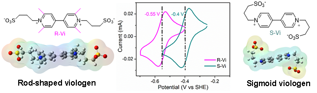 针对上述问题,西安交通大学宋江选教授团队采用分子空间结构调控策略,在紫精分子主体结构—联吡啶环的2,2,6,6-四个位置接枝甲基,得到了一种渗透率低、稳定性高且氧化还原电位更负的新型“棒状”紫精分子(R-Vi)。作者通过二维核磁共振谱(2D-NOE)和密度泛函理论计算确证了分子空间结构。结果表明,活性中心邻位接枝的四个甲基的电子诱导效应可显著降低紫精分子的氧化还原电位(-0.55 V vs. SHE),是目前报道紫精分子中的最低电位。更为重要的是,该策略通过空间位阻效应改变了紫精分子的空间构型,即由未改性的“S状”(S-Vi)变为“棒状”(R-Vi)。这一改变增加了紫精活性分子的尺寸(456.1 Å3增大至542.6 Å3),将分子渗透率降低至1.25×10-10cm2s-1,仅为S-Vi的14.7%。此外,“棒状”构型对紫精还原态的二聚具有抑制作用,进一步提升了紫精的循环寿命。以R-Vi为负极,K4Fe(CN)6为正极构建的水系液流电池3200圈循环后容量保持率高达77.6%,容量衰减率仅为0.007%每圈。本文提出的分子工程修饰策略提高了紫精分子的综合电化学性能,拓宽了有机活性材料的设计思路。该成果以“Spatial Structure Regulation: A Rod-Shaped Viologen Enables Long Lifetime in Aqueous Redox Flow Batteries”为题发表于国际知名期刊《Angew. Chem. Int. Ed.》,博士研究生李宏斌为论文第一作者,宋江选教授和范豪助理教授为通讯作者,西安交通大学金属材料强度国家重点实验室为论文唯一通讯单位。这也是该团队继前期五元环氮氧自由基(Adv. Funct. Mater. 2021,37,35,2102734)、六元环哌啶类氮氧自由基(ACS Appl. Mater. Interfaces, 2020, 12, 39, 43568)、吩噁嗪类碱性兰(Chem. Commun., 2020, 56, 13824)水性液流电池电极材料研究工作之后的又一重要进展。