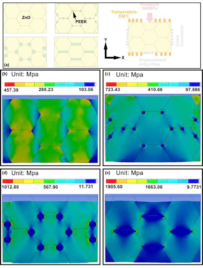 近日,西安交通大学材料科学与工程学院汪宏教授、郭靖特聘研究员课题组与国内外专家合作,采用冷烧结技术在300-330℃低温烧结条件下成功地将热塑性聚合物聚醚醚酮(PEEK)与半导体陶瓷ZnO复合,制备出致密的ZnO基复合材料。在制备复合材料粉末的时候,采用了两种方法,分别是溶解法和直接混合法。采用溶解法时,大尺寸PEEK颗粒可以被混合溶液溶解,冷烧结后在ZnO晶粒间形成了纳米级的晶界。而采用直接混合方法制备得到的样品在冷烧结后观察到大尺寸PEEK颗粒。通过有限元分析可以发现,ZnO的晶界以及ZnO和PEEK的界面处出现了应力集中现象,并且这些应力随着PEEK粒径的增加而增加。最终研究表明溶解法制备的95ZnO-5PEEK压敏材料在冷烧结后具有3070V/mm(@0.1 mA/mm2)的超高击穿电场。