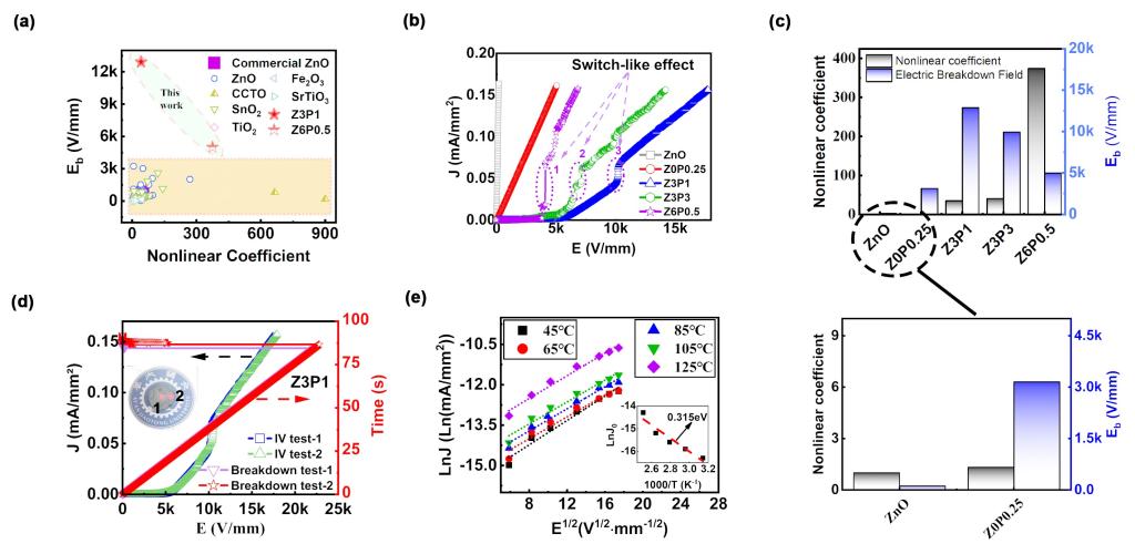 此外,研究团队还通过冷烧结技术将PEEK与几种纳米金属氧化物集成到ZnO陶瓷基体形成复合压敏电阻。纳米尺度的混合添加剂分散在高密度的ZnO晶粒结构之间,形成肖特基势垒,显著提高了复合材料的电学性能,在0.1mA/mm2的击穿电场超过了13kV/mm1。此外,该复合材料表现出类似于功率开关器件的“类开关效应”,具有极高的非线性系数,最高可达375。鉴于聚合物和金属氧化物掺杂剂可选择的多样性,该工作提供了一种独特的高击穿电场、高非线性系数的陶瓷基压敏材料设计方法。