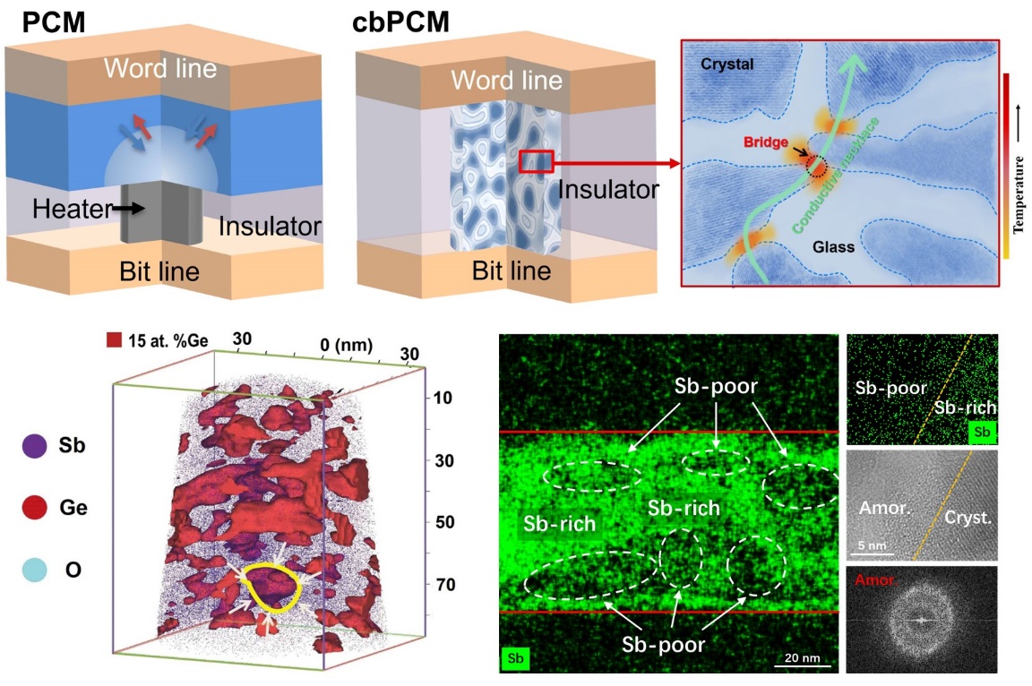 为了解决该问题,华中科技大学信息存储材料及器件研究所(ISMD)联合西安交通大学材料创新设计中心(CAID)研发了一种“导电桥”相变存储器,即设计了新型相变材料锗-锑-氧合金,利用材料的自发分相在存储器件的相变介质层中形成由高阻态非晶网络包围多个低阻态纳米“晶体岛”的异质网络结构。在存储器的操作过程中,异质网络结构基本保持不变,仅通过链接或断开“晶体岛”之间数纳米尺寸的“导电桥”即可实现数据的写入和擦除,极大地减少了相变存储器件的有效相变体积,将数百纳米制程相变存储单元的擦写功耗降低至0.05 pJ,与主流产品的功耗相比降低了一千倍,打破了存储器编程过程中功耗与电极/相变介质层接触面积之间成正比的比例关系。“导电桥”相变存储器也保证了较好的一致性和使用寿命。