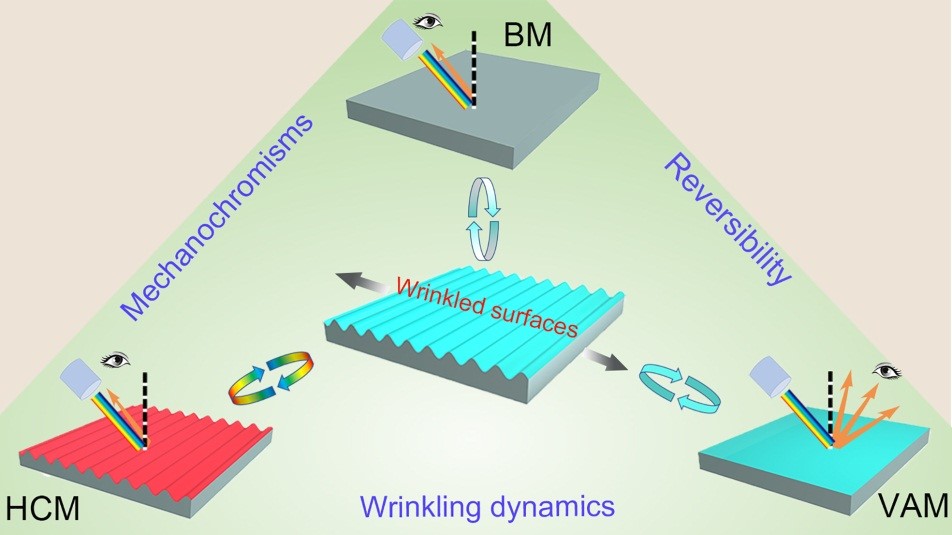 针对上述问题,西安交大金属材料强度国家重点实验室孙军院士团队提出了一种基于褶皱表面动态调控实现多种力致变色行为的新策略。采用极其简单的SiOx/PDMS材料体系,通过巧妙控制力响应型动态褶皱表面,实现了不同类型的力致变色效应,分别为力致亮度改变型(brightness mechanochromism, BM)、力致颜色改变型(hue change mechanochromism, HCM)、力致可视角改变型(viewable angle mechanochromism, VAM) (如图所示),并探索了力响应型褶皱表面在智能显示、防窥防伪、柔性应变传感等领域的潜在应用。上述策略制备工艺简单,成本低,材料可逆性和稳定性优异,具有潜在的商业前景。