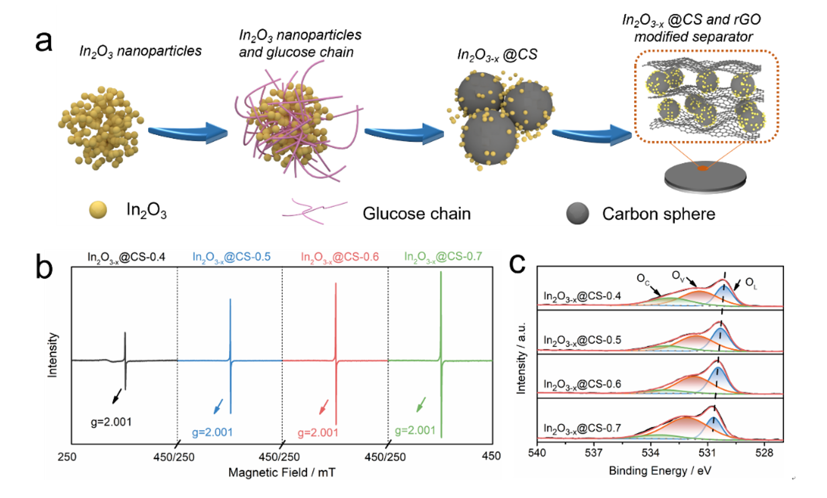 图1. a)水热还原法制备具有氧空位的In2O3-x与碳球复合物的示意图,b),c)不同氧空位浓度的In2O3-x与碳球复合物的EPR和XPS测试。
