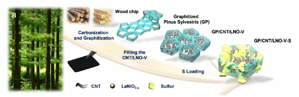 3.构建了一种基于樟子松生物质管道的限域型碳基体与缺陷型钙钛矿(LaNiO3-x)复合结构。这种自支撑复合结构具有载硫、集流一体化功能,可以省去传统正极制备过程中的混料、涂料、裁片等工艺。此外,凭借于垂直且独立的管道结构,该复合结构能够在横向方向绝对的防止多硫化锂扩散。另一方面,基于LaNiO3-x表面氧空位对多硫化锂的快速捕捉和催化转化能力,该复合结构对多硫化锂的纵向扩散也具有强列的抑制作用。因此,搭载这种复合电极的锂硫电池表现出超高的循环稳定性(S:4.4 mg cm-2,电流:0.5 C,容量保持率:99 %)和高面积比容量(S:11.6 mg cm-2,面积比容量:8.5 mAh cm-2)。该工作以《多约束几何缺陷工程助力硫正极》(Defect Engineering in a Multiple Confined Geometry for Robust Lithium–Sulfur Batteries)发表在国际顶级期刊《先进能源材料》(Advanced Energy Materials,IF:29.368)上。本文第一作者为邹坤洋博士,共一为安徽大学周腾飞教授。西安交通大学陈元振、柳永宁教授与澳大利亚阿德莱德大学郭再萍教授为共同通讯作者。