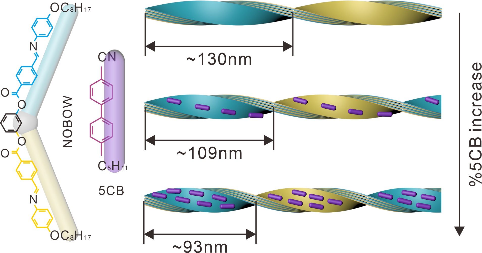 针对上述科学问题,西安交通大学材料学院、物理学院与美国劳伦斯伯克利国家实验室研究人员合作,利用共振软X射线散射(RSoXS)研究了这一结构在非手性小分子(5CB与正辛烷)掺杂条件下的自组装行为,从分子层面解析了结构中的分子排布模式以及螺距调控机理。