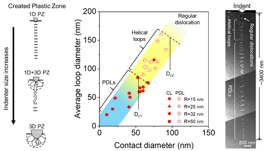 针对上述问题,西安交通大学单智伟教授团队利用聚焦离子束制备了一系列尺寸不同的压头,采用原位透射电镜纳米压入技术,以单晶铝基体为模型材料,原位观测了pop-in发生时压头下方位错的形核类型以及所形成的位错塑性影响区构型。结果表明,位错塑性区的形状与压头尺寸紧密相关,如图1(左)所示。若假定压头顶部为半球状,则当其直径大于~100 nm时,pop-in发生后会在压痕下方形成半球状分布的“三维”塑性区,内部有高密度的常规位错,与传统认知完全相符。然而,当压头直径继续减小到~50 nm时,在半球状的塑性区顶部将会出现一个由棱柱位错环和螺旋位错所组成的“一维”塑性区。进一步减小压头直径到~15纳米,则塑性区将完全呈现为一维形状,全部由规律分布的棱柱位错环组成(图1右)。非常有意思的是,位错环的直径和压头的接触半径成正相关的关系(图1中)。