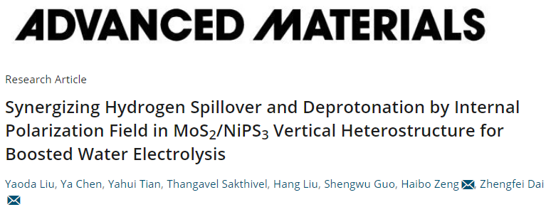 该研究成果以《MoS2/NiPS3垂直异质结构中内建极化场协同氢溢流和去质子化促进水电解》(Synergizing Hydrogen Spillover and Deprotonation by Internal Polarization Field in MoS2/NiPS3Vertical Heterostructure for Boosted Water Electrolysis)为题发表在《先进材料》(Advanced Materials上)。西安交通大学金属材料强度国家重点实验室为论文第一作者单位和第一通讯单位,戴正飞研究员和曾海波教授为论文共同通讯作者,博士生刘耀达为论文第一作者。研究工作得到国家自然科学基金、陕西省自然科学基金、西安交通大学青年拔尖人才支持计划等项目的资助。