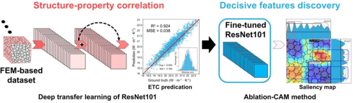 近日,材料学院强度室的邓俊楷教授课题组,利用深度学习和可解释机器学习技术,针对UO2-BeO复合燃料微结构和热导率的关联性开展了研究。首先通过高通量有限元计算,获得一批与实际微结构相符的复合燃料模型与热导率的材料数据集。为解决因数据量不足且样本区分度不高的问题,研究中采用了深度迁移学习,有效的减小了数据标定所需的数据集规模,并大幅提高了热导率机器学习预测模型的性能。随后,利用可解释机器学习技术和基于物理直觉的参数模型,成功识别并提出了对复合燃料热导率具有重要影响的关键微结构特征,并对其进行了验证。通过深度学习方法提取的影响复合燃料热导率的关键微结构特征,将对高热导的复合燃料设计提供理论指导,并有望通过先进的增材制造技术实现。