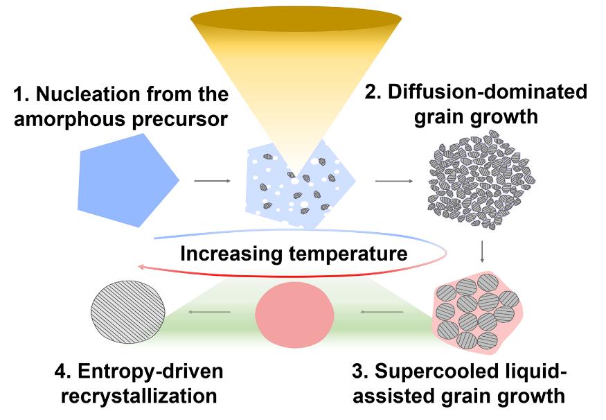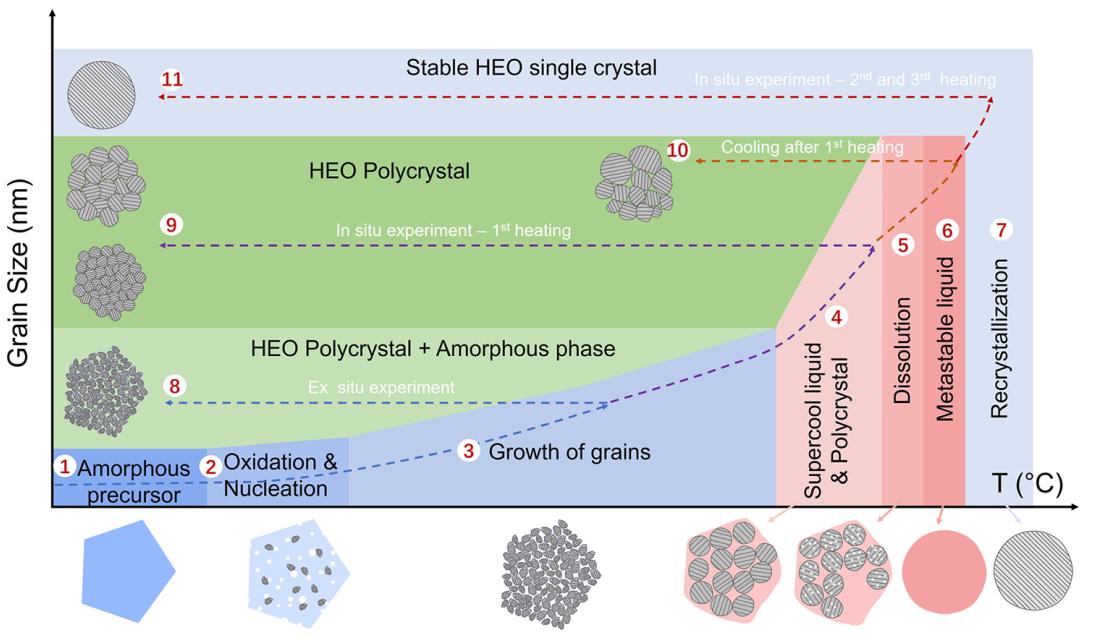 针对这一问题,bb贝博艾弗森官网王红洁教授课题组和美国北卡莱罗纳州立大学、上海交通大学高文旆教授课题组合作,以自制高熵萤石型氧化物前驱体为研究对象,运用气相高分辨原位扫描透射电子显微技术,发现了聚合物前驱体形成高熵萤石氧化物的四个阶段(图1),包括低温段聚合物前驱体的氧化和形核(1→2)、扩散控制晶粒生长(1→3→8)、自生液相过冷度控制的晶粒生长(1→4→9/1→6→10),以及液相辅助成分均匀化后更高温度下的熵驱动重结晶和稳定化(1→7→11)(图2)。该工作从原子尺度揭示了高熵氧化物的形成机制,为进一步设计和制备具有可控形态、结构和性能的高熵氧化物陶瓷奠定了基础。