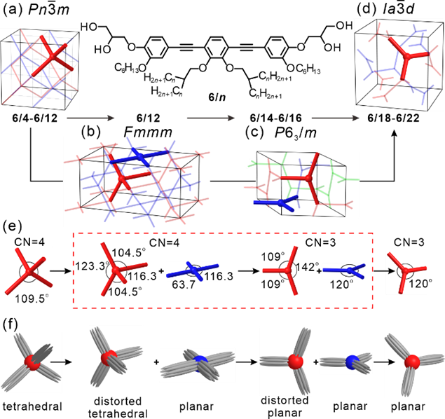 近期,西安交通大学材料学院刘峰教授团队与德国马丁路德·哈勒维腾贝格大学的Carsten Tschierske教授合作,并借助上海同步辐射光源(SSRF)小角X射线散射线站与我校分析测试中心的小角X射线散射仪,研究了一系列多亲性同系物分子在不同温度下的自组装行为,首次提出了一种新的DD-DG相变路径:将DD结构的四面体节点扭曲得到Fmmm结构的扭曲四面体节点和平面四重节点,进一步在六方P63/m结构中变为扭曲的和非扭曲的三重平面节点,最后得到只有非扭曲三重节点的DG结构。相变过程中结构的配位数(CN)的变化为4-4-3-3。相变过程以能量最低为原则,极小曲面与节点的六边形密排互相竞争,得到具有不同节点形状的四种结构。该研究所提出的全新的DD与DG结构之间相变机制,对从结构和分子层面更深入理解相变过程和进一步调控相变具有重要指导意义。