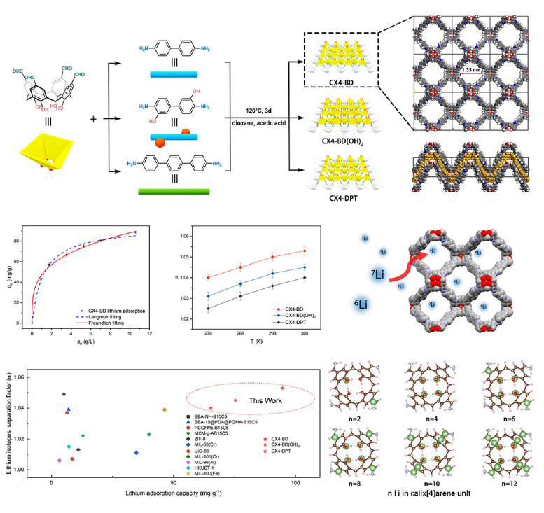 近日,西安交通大学金属材料强度国家重点实验室刘学特聘研究员、丁向东教授与中科院高能物理研究所石伟群研究员合作提出杯芳烃锂同位素分离新体系。实验合成了三种杯[4]芳烃修饰的共价有机框架材料(COFs),该材料结晶性较好,具有波浪形二维层状结构及AA堆叠方式。该系列COFs对锂的吸附容量可达94.66 mg·g-1,锂同位素分离系数达到1.053±0.002,为目前报道的最佳材料。该工作首次证明了杯芳烃及COFs材料在锂同位素分离中的巨大潜力。密度泛函理论(DFT)计算及XPS谱图分析证明高锂吸附容量来自于杯芳烃结构上丰富的活性吸附位点。这项工作为杯芳烃基COFs的进一步应用提供了新的方向,同时也为设计制备具有高吸附性能和高同位素分离水平的锂同位素分离材料开辟了新的道路。
