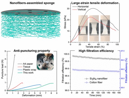 近日,bb贝博艾弗森官网王红洁教授课题组发展了一种可控的化学气相反应方法,开发出一种由取向性高且相互纠缠的氮化硅纳米纤维构筑的超轻陶瓷海绵。该材料不仅具有良好的拉伸(20%拉伸应变下可弹性回复、断裂伸长率高达80%以上)和压缩(80%应变完全回弹)性能,还表现出优异的抗穿刺性。得益于独特的3D网络结构,该陶瓷海绵空气污染物的过滤效率高达99.8%以上,而其压降却仅为棉纤维滤芯的38%。这些综合性能使其具备了在复杂应力条件下的长效空气过滤能力,在空气污染治理等方面具有潜在应用价值。