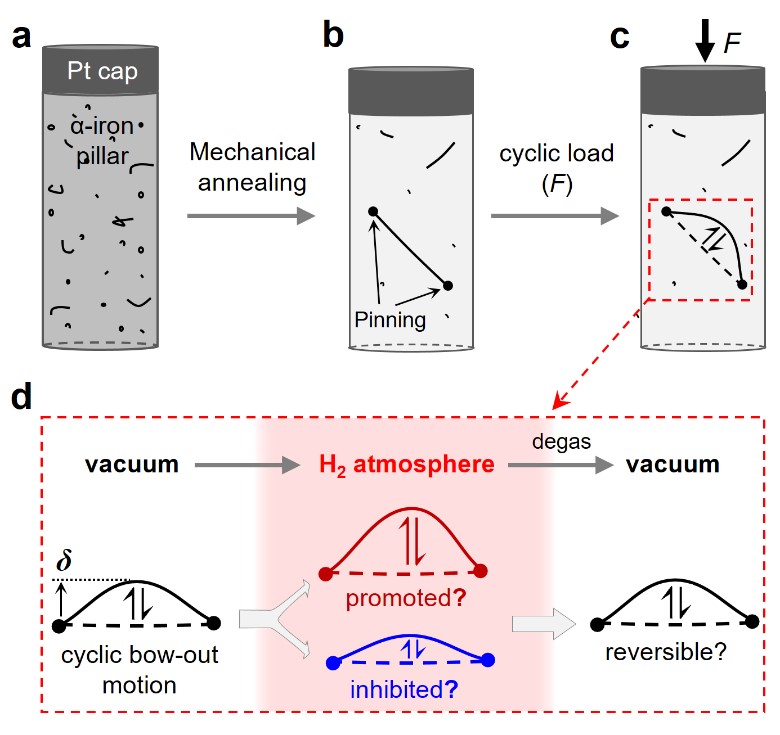 氢元素不仅以氢气和硫化氢广泛存在于能源和石化行业中,也以液态水和水蒸气的形式在地球表面无处不在。由于氢的原子半径极小,很容易进入到材料内部导致材料塑性降低和延迟开裂,导致所谓的氢脆。氢脆具有易发生、难预防的特点,一旦发生往往造成重大安全事故,因而是交通、能源、石化等多个行业共同关注的材料安全难题。钢铁是用途最广、用量最大,氢脆问题也最为显著的金属结构材料。对氢脆内在机理的准确认知是建立氢脆预测模型和材料抗氢脆设计的基础。尽管目前所提出的氢脆机理很多,但都仅能对部分氢脆现象给予合理的解释,这表明氢脆复杂表象背后的基本物理机理仍没有被揭示,而其中最关键的问题就是塑性载体位错(在钢铁材料的塑性变形中,螺位错起主导作用)和氢之间的相互作用机理。随着技术的进步,在过去的几十年间,学者们进行了大量关于氢对位错运动行为影响的研究,但都未能实现在单个位错水平上对氢和位错的交互作用进行定量的测试。