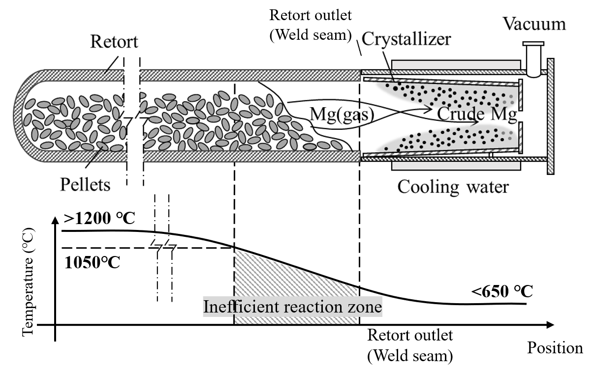 基于气态原子选择性分离的新原理,在充分考虑还原罐罐口附近温度场和压强分布的前提下,通过巧妙的“阻热梯凝器”装置发明,一方面通过阻挡还原罐罐口附近料球侧的热量散失,提升了位于该处料球的温度,进而提升了料球的产镁量;另一方面,通过在冷凝介质上形成温度梯度来大幅去除高熔点、低饱和蒸气压杂质。同等条件下,使用“阻热梯凝器”后,料镁比(原料与所产镁的质量比)从6.59降至5.95;同时,粗镁纯度从不足国标Mg9980提升至Mg9995A。基于上述原理和发明,依托合作企业现有的横罐装备,建成全国首条千吨级Mg9995A高品质镁示范产线,在不降低产量,不增加工人劳动强度,不显著增加成本的前提下,使得Mg9995A的产率从不足1%提升到超过90%。相关成果获得了国际镁学会2022年工艺创新奖和中国材料研究学会2023年技术发明一等奖。