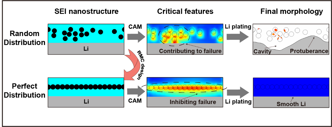 近日,材料学院强度室邓俊楷教授课题组针对上述挑战,同材料学院宋江选教授合作,利用深度学习技术对锂金属负极SEI膜微结构-机械耐久性的映射关系进行研究。研究团队通过有限元高通量计算,随机建立SEI膜微结构与其机械失效时间的对应数据集,并使用卷积神经网络进行训练,建立了二者的对应关系。随后利用逆向蒙特卡洛与卷积神经网络相结合的方法对SEI膜微结构进行优化,设计出晶态颗粒均匀排列的SEI膜微结构,并理论验证该微结构具有优异的机械耐久性。该工作基于类激活映射图技术以及进一步的有限元计算,识别了决定SEI膜机械耐久性的关键结构特征以及深层物理机理,建立了锂金属负极SEI模微结构-机械耐久性的映射关系,有助于理解SEI膜机械失效的微观机理及晶态颗粒分布对于机械失效的影响,对于人工SEI膜的设计与实现有一定的指导意义。