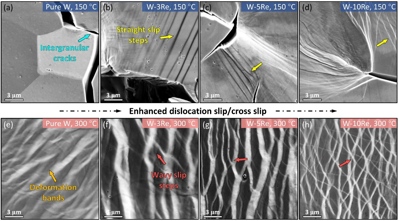 近日,西安交通大学材料学院韩卫忠教授团队通过冲杆试验(Zhang YH, et al. Acta Materialia 220 (2021) 117332),对再结晶态的W-Re合金进行了系统研究,揭示了其韧脆转变的关键缺陷机制,并阐明了低含量(≤10 wt.%)的Re合金化并不能有效降低W的韧脆转变温度。研究人员发现Re合金化引起的有限韧化仅发生在很窄的低温区间(50 °C~200 °C)。高温(≥300 °C)变形时,W-Re合金的塑性变形能力明显降低,最终导致合金高温韧性下降、韧脆转变温度升高。而且Re含量越高,W-Re合金的韧脆转变温度越高(如图1所示)。通过表面变形形貌的表征发现,相比于纯W的沿晶开裂,Re合金化促进了更多的位错行为,从而增加了W-Re合金的低温韧性,但这一改善非常有限。此外,当变形温度升高到300 °C时,W-Re合金中还出现了大量的位错交滑移现象。随着Re含量的增加,交滑移程度越来越剧烈(如图2所示)。有趣的是,虽然W-Re合金在高温下发生了大量的位错交滑移,但其变形能力和韧性反而变差了。