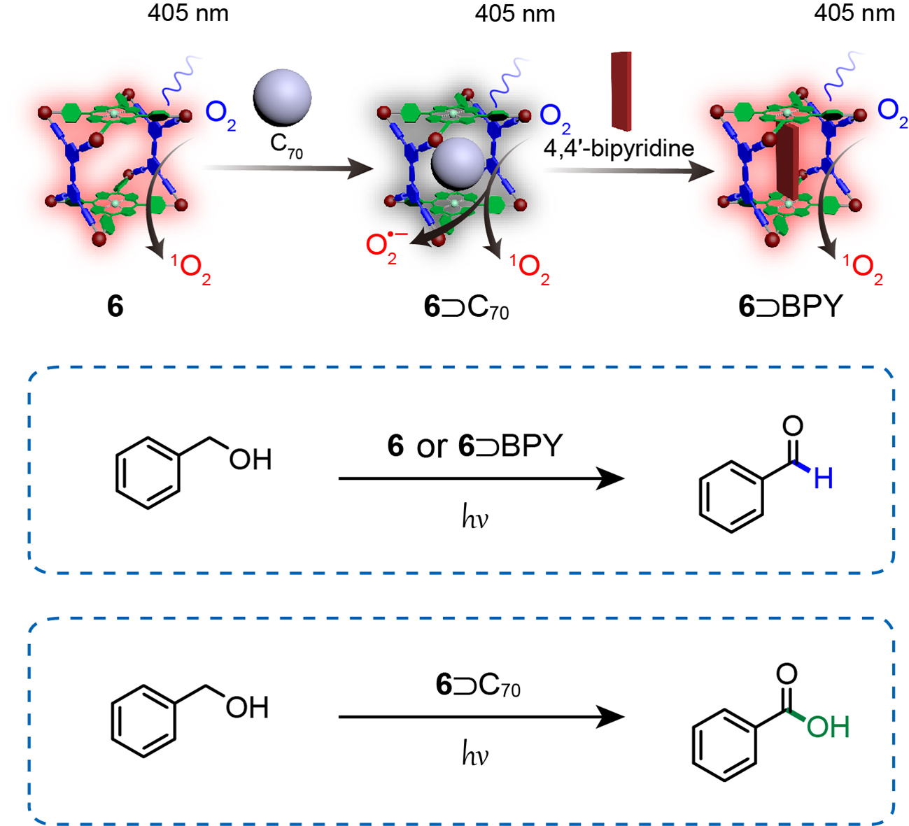 针对这一问题,西安交通大学材料学院张明明教授课题组通过配位自组装,构筑了一类基于卟啉的多组分金属笼,并通过金属笼的主客体性质来调控活性氧物种的产生,实现了对苯甲醇的选择性光催化氧化。作者研究发现,在405nm光激发下,金属笼(6)能够有效地通过激发态能量转移的方式生成单线态氧(1O2)。然而,当金属笼(6)与C70结合形成主客体配合物(6⊃C70)后,电子转移途径被打开,从而促进了超氧阴离子自由基(O2·−)的产生,同时生成1O2与O2·−。接着,在配合物6⊃C70中引入4‘4-联吡啶(BPY)时,可以与金属笼配位形成稳定性更高的配合物(6⊃BPY),将C70从空腔中挤出去,恢复高效的1O2产生能力。接下来作者对苯甲醇光催化反应进行了探究。结果表明,配合物6和6⊃BPY可以有效的将苯甲醇氧化为苯甲醛,而配合物6⊃C70则可以将其氧化为苯甲酸,该类反应的产率与选择性都可以达到90%以上。本研究不仅展示了一种可调控的基于金属笼状化合物的主客体识别模式,还探讨了其在选择性光催化中调节活性氧(ROS)生成的潜力。近日,该研究成果以《卟啉金属笼主客体化学调控活性氧的生成用于选择性光催化》(Guest-Regulated Generation of Reactive Oxygen Species from Porphyrin-Based Multicomponent Metallacages for Selective Photocatalysis)为题发表在国际化学领域权威期刊《德国应用化学》(Angewandte Chemie International Edition)上。该论文第一作者为西安交大材料学院博士生高科、硕士生程颖与张泽远副教授,通讯作者为西安交大材料学院张明明教授、张泽远副教授与尚晓博副教授。西安交大金属材料强度国家重点实验室是论文第一通讯单位。