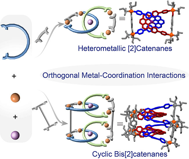因此,西安交通大学材料学院张明明教授课题组利用Cu/菲罗啉单元与Pt/吡啶/羧酸的正交自组装,高效制备了一系列双金属核[2]索烃和环状双[2]索烃,其结构得到了单晶X射线衍射的验证。该工作首次报道了由正交金属配位自组装制备的刚性环状双[2]索烃,为利用索烃来构筑高阶机械互锁结构提供了新的思路。之后作者发现这类结构具有广谱的抗菌性能,为高阶超分子结构在生物医学领域的应用提供了借鉴。近日,该研究成果以《基于正交金属配位作用的异核双金属[2]索烃和环状[2]索烃的高效自组装》(Highly Efficient Self-Assembly of Heterometallic [2]Catenanes and Cyclic Bis[2]catenanes via Orthogonal Metal-Coordination Interactions为题发表在国际化学领域权威期刊《德国应用化学》(Angewandte Chemie International Edition)上。该论文的第一作者为西安交大材料学院博士生冯倩、西安交大前沿学院博士生丁睿与西安交大材料学院侯亚丽博士,通讯作者为西安交大材料学院张明明教授,西安交大金属材料强度国家重点实验室是论文第一通讯单位。