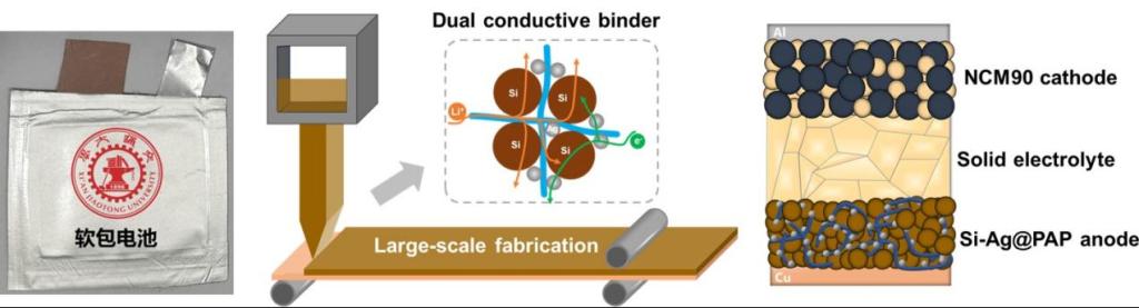 宋江选教授团队作为国资委固态电池创新联合体主体成员,面向国家重大能源需求开展研究。近日,团队提出离子-电子混合导电粘合剂构建三维载流子快速传输新策略,解决硫化物固态电池大规模制备和循环寿命难题。该策略避免了高成本、空气敏感的硫化物固态电解质的使用,同时极片加工可兼容传统锂离子电池生产线,无需干房等苛刻条件,极大地节约了能源和成本,为固态电池的大规模应用提供了新思路。基于该粘合剂制备的硅负极容量高达1906.9 mAh g-1,构建的高比能全固态电池在5 C条件下稳定循环2,000次。该成果以《离子-电子混合导电粘合剂助力硅基硫化物全固态电池大规模制造》(Large-Scale Fabrication of Stable Silicon Anode in Air for Sulfide Solid State Batteries via Ionic-Electronic Dual Conductive Binder)为题发表在国际顶级期刊《先进材料》(Advanced Materials)上。