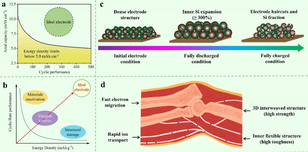 在全球能源科技革新的浪潮中,高比能电池的研发已成为国防军工及社会经济领域不可或缺的一环,能够为特种装备与新能源汽车提供更持久、更稳定的动力支持,对于强化武器装备作战能力、推动社会经济可持续发展具有重大战略意义。高比能电极材料作为提升电池能量密度的关键,其结构稳定性是储能材料领域追求的永恒主题。硅负极具有高比容优势(理论容量4200 mAh/g),有望超越传统体系,大幅提高电池能量密度(>500 Wh/kg),契合未来储能发展需求。然而,硅负极在电化学过程中物质交换引发结构畸变,导致服役寿命与高比能之间呈现出反向制约关系,严重制约了其规模应用。