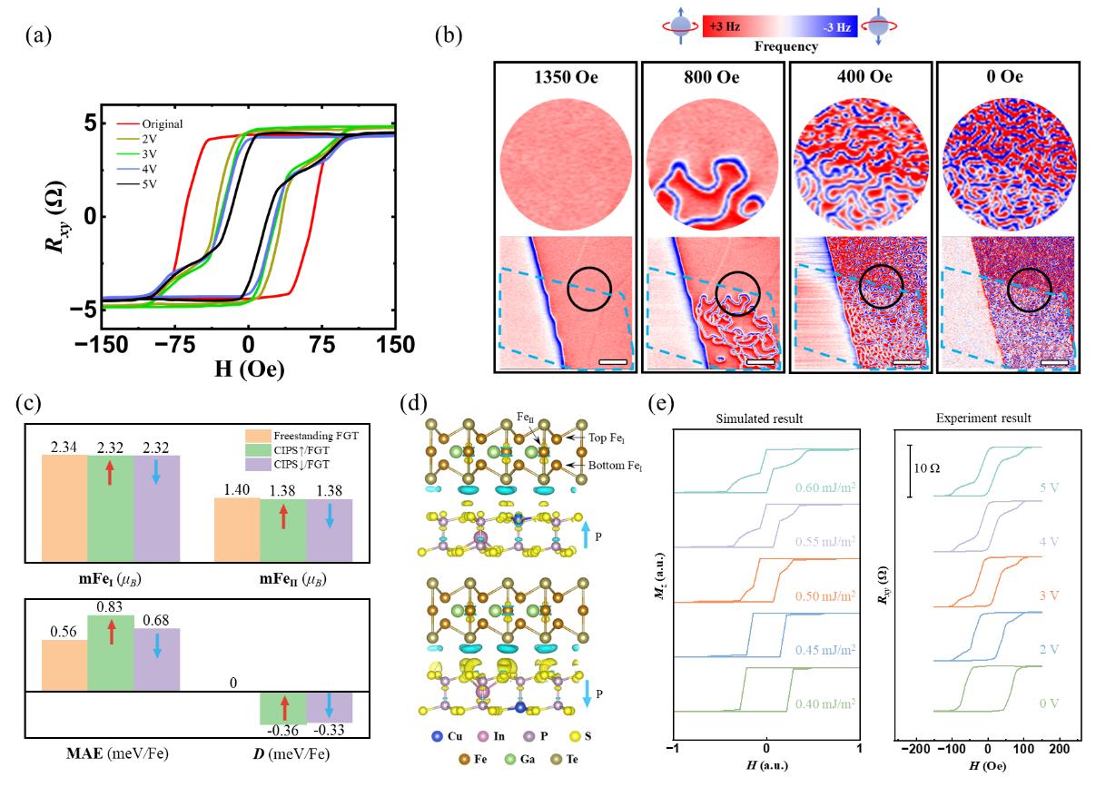 团队围绕该异质结从多个尺度开展了系统研究:通过霍尔测试显示出磁滞回线随极化电压的显著变化,表明磁性状态可被稳定调控;以磁力显微镜成像清晰捕捉了磁畴在电场、磁场、温度作用下的动态演化过程;通过第一性原理计算揭示了极化态诱导的界面DMI增强效应;结合微磁模拟复现了霍尔测试中观察到的磁化翻转行为。研究表明,电极化驱动的界面DMI调控机制能够降低磁畴壁形成能、促进磁畴的非协同(non-coherent)翻转,从而实现铁磁性的非易失调控。本项研究不仅实现了全二维异质结构在室温下的磁电耦合调控,还在理论机制与实验观测之间构建了高度一致的物理图像,为后续自旋电子器件的功能设计与材料开发提供了参考,使其在低功耗存算器件、拓扑磁结构调控等领域具备广阔的应用前景。