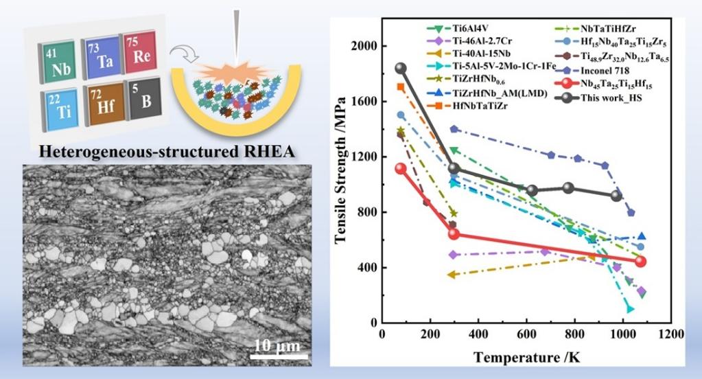 在航空航天、核能以及先进制造等前沿领域,结构材料需要在从深冷到高温的复杂环境中长期稳定服役。然而,传统合金普遍存在强度–韧性矛盾:强度提升往往伴随延展性降低,且在高温下强度衰减尤为明显。难熔高熵合金(RHEAs)由Nb、Ta、Mo、W、Hf等高熔点元素组成,凭借其优异的高温性能备受关注,但迄今仍难以在宽温域内兼顾高强度与高延展性。近年来,异质结构金属材料因其可诱发异质变形诱导强化(HDI)效应而备受瞩目,为解决强度–韧性矛盾提供了新思路。