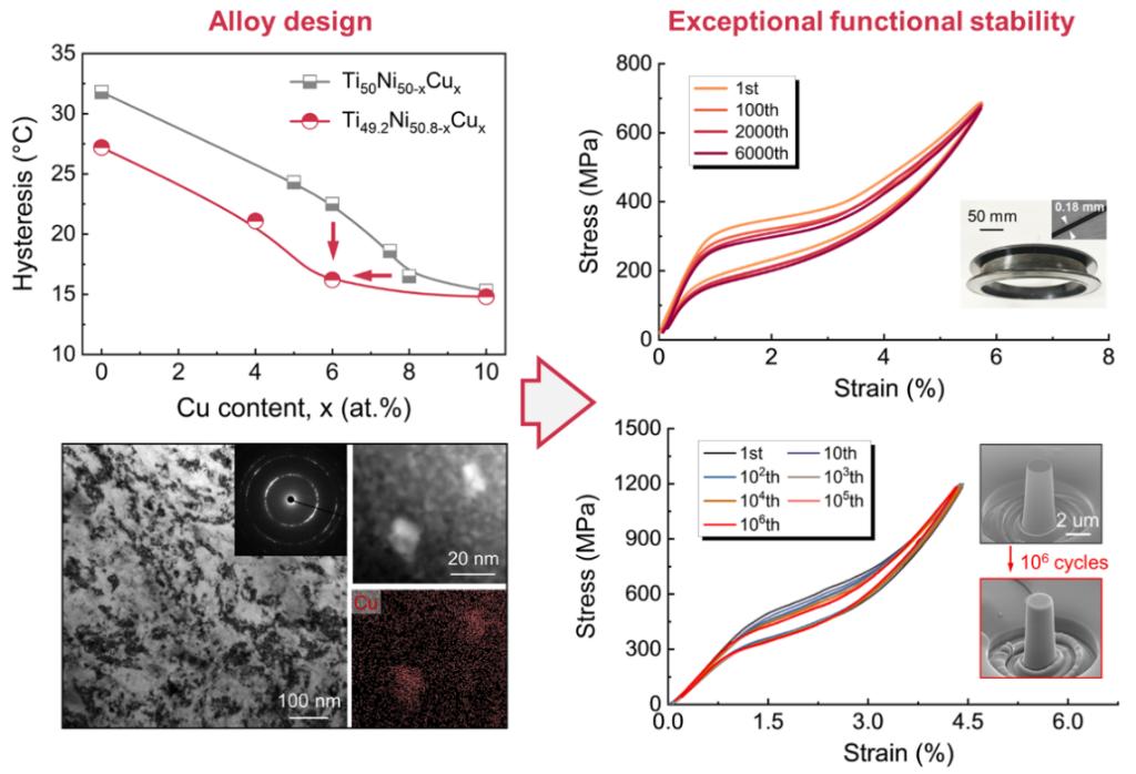 TiNi基合金因其优异的形状记忆效应和超弹性等特性,在航空航天、机器人、医疗器械和固态制冷等领域展现出广阔的应用前景。然而,传统TiNi基合金普遍面临“大功能响应”与“高循环稳定性”难以兼顾的挑战,即在呈现较大可回复应变或显著弹热效应时,材料易发生性能衰减,严重制约其长期可靠应用。因此,如何在大功能响应与高循环稳定性之间实现协同优化,已成为形状记忆合金领域亟待突破的一个瓶颈问题。