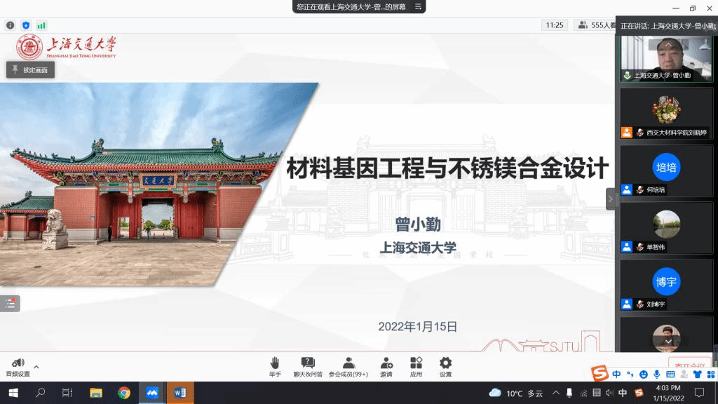 曾小勤教授做客周惠久论坛线上讲座,以“材料基因工程与不锈镁合金设计”为题,系统地介绍了基于材料基因工程思想的不锈镁合金的设计和制备。报告受到广泛关注,来自西安交大及其他高校、科研院所的930余名师生在线参加了讲座。本次讲座由单智伟院长主持。